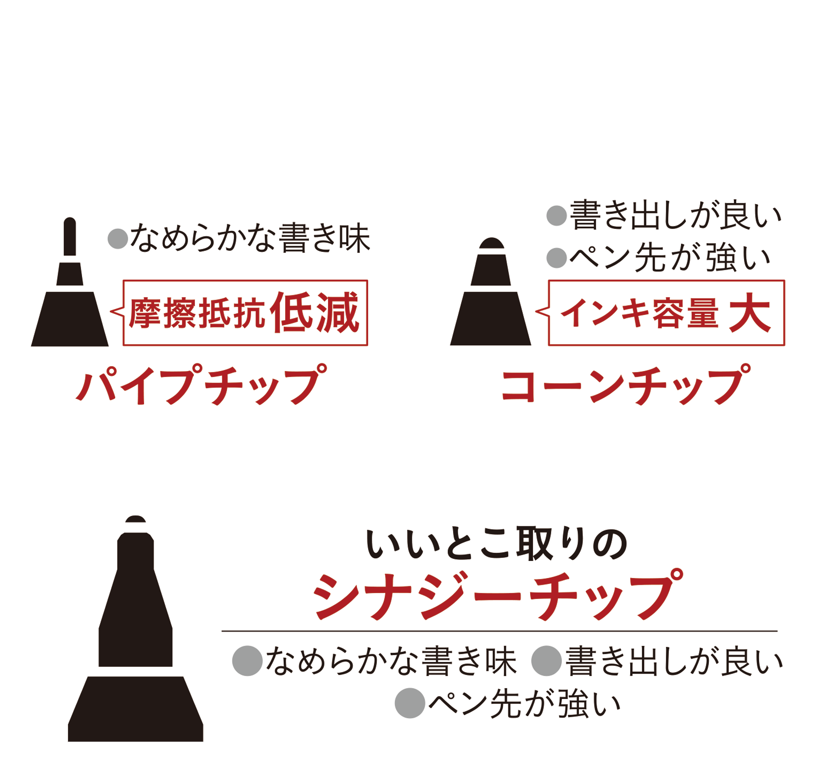 「フリクションシナジーノック」は、ペン先の強度が高く、インキの供給がスムーズなパイロット独自開発のペン先「シナジーチップ」を採用しています。これにより、細書きでありながら書き出しが良く、なめらかな書き味を実現しています。従来の0.4mmに加え、0.5mmと、フリクションシリーズでは最細となる0.3mmも揃えています。